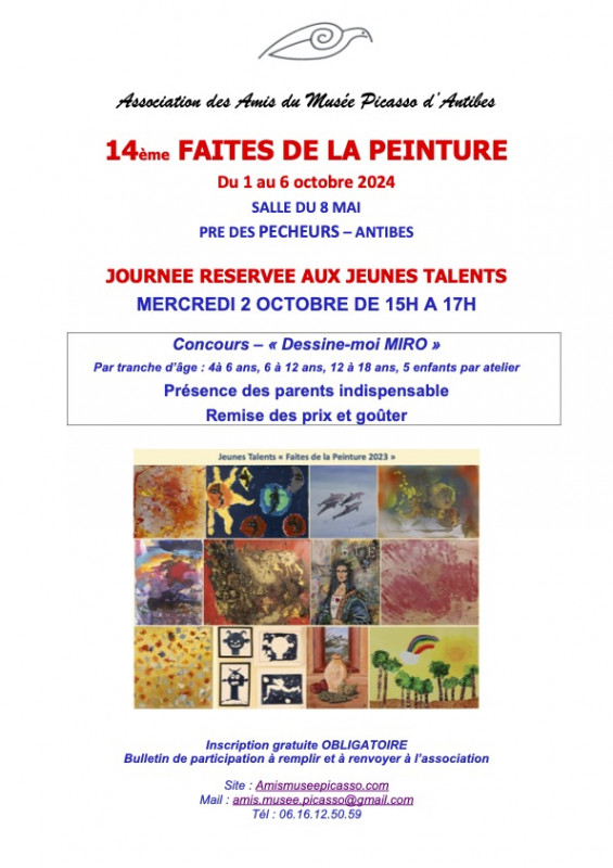 A l'initiative de l'Association des Amis du Musée Picasso d'Antibes, les artistes amateurs ou professionnels, peintres ou sculpteurs, jeunes talents de 4 à 18 ans, exposeront leurs œuvres emblématiques du 1 au 6 octobre 2024à la salle du 8 mai d'Antibes.