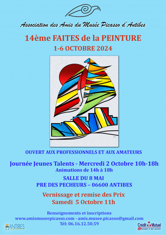 A l'initiative de l'Association des Amis du Musée Picasso d'Antibes, les artistes amateurs ou professionnels, peintres ou sculpteurs, jeunes talents de 4 à 18 ans, exposeront leurs œuvres emblématiques du 1 au 6 octobre 2024à la salle du 8 mai d'Antibes.